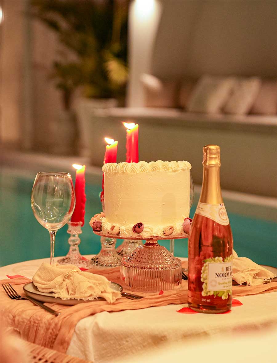 Sweet Celebration: Indulge in a decadent cake, the perfect sweet ending to your romantic journey.
